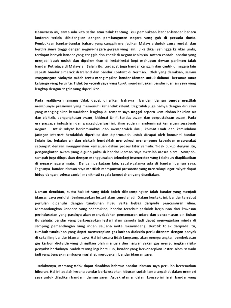 Karangan bahagian a karangan berpandu kehendak soalan. Panjangnya huraian hendaklah antara 200 hingga 250 patah perkataan. Selain itu terdapat juga bandar canggih dan cantik di negara lain seperti bandar limerick di ireland dan bandar kontanz di german. Calon mesti menjawab berdasarkan maklumat yang diberikan taman rekreasi terancang kemudahan awam moden kecanggihan teknologi maklumat dan komunikasi kemungkinan.