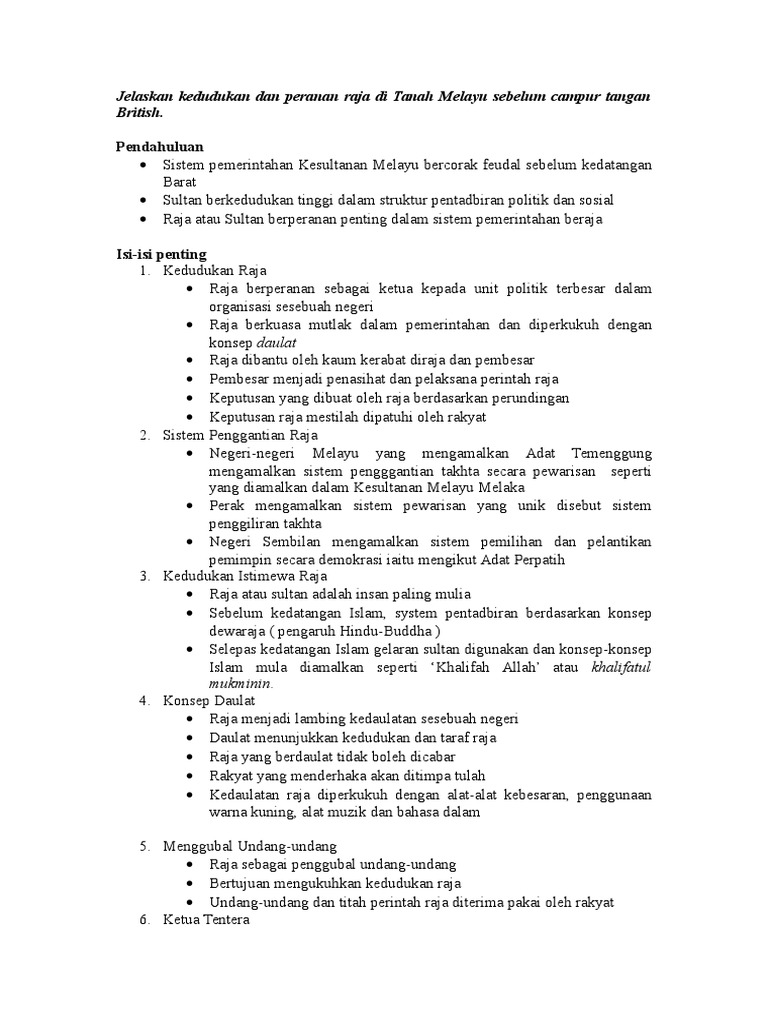 Jelaskan Kedudukan Dan Peranan Raja Di Tanah Melayu Sebelum Campur Tangan British