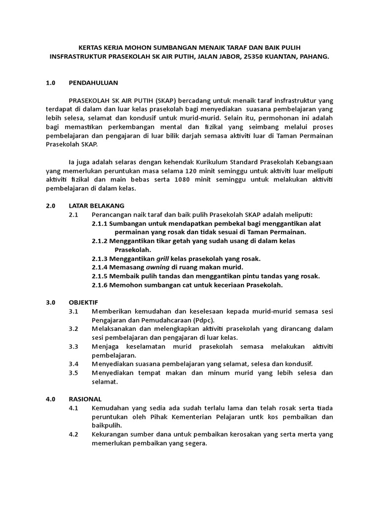 Kertas Kerja Mohon Sumbangan Menaik Taraf Infrastruktur Prasekolah Sk Air Putih