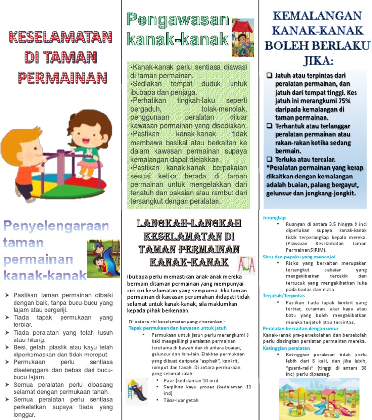 Keselamatan kanak kanak di taman permainan. Langkah langkah keselamatan di taman permainan kanak kanak ibubapa perlu memastikan anak anak mereka bermain ditaman permainan yang mempunyai ciri ciri keselamatan yang sempurna. Kecederaan tapak permainan yang teruk termasuk keretakan dislokasi kecederaan dalaman dan gegaran. Jika taman permainan di kawasan perumahan didapati tidak selamat untuk kanak kanak sila maklumkan kepada pihak berkenaan. Penting bagi ibu ayah untuk memastikan tiada peralatan yang rosak permukaan yang tidak wajar dan tingkah laku tidak selamat di kalangan kanak kanak tidak merosakkan keseronokan.