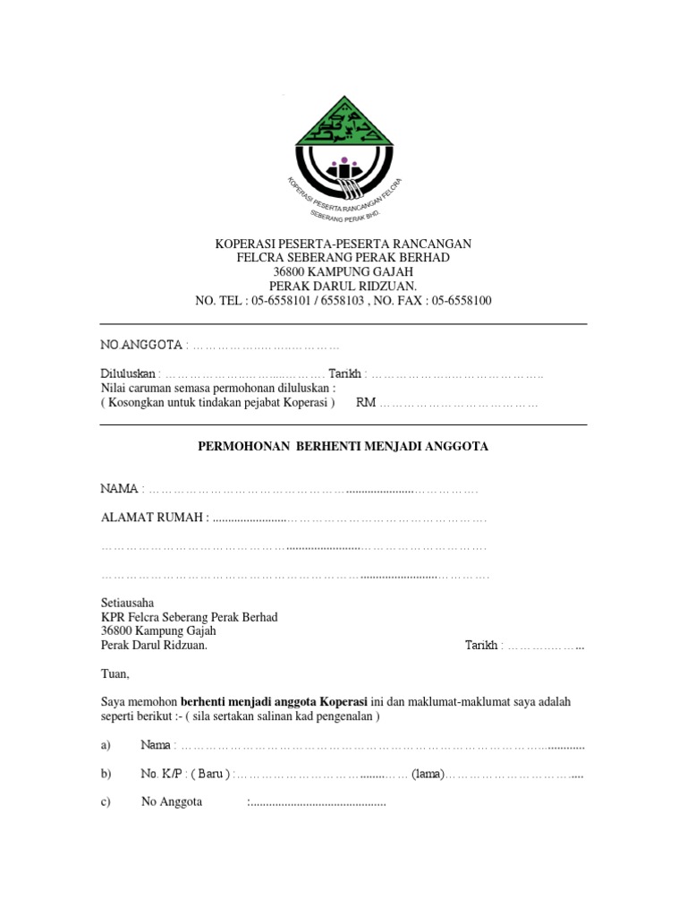 Borang Pesrmohonan Berhenti Menjadi Anggota Kpr Felcra Seb Perak