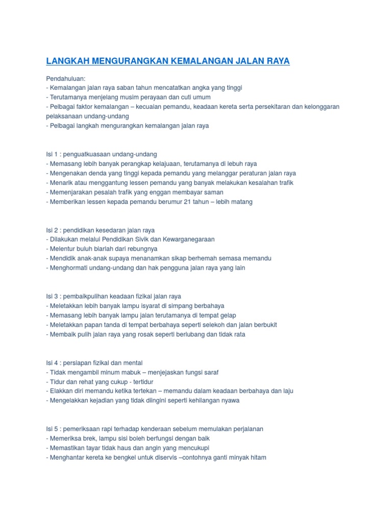 Kerangka Karangan Langkah Langkah Mengatasi Kemalangan Jalan Raya