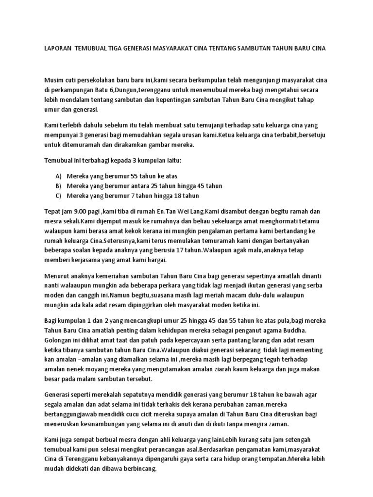 Laporan Temubual Tiga Generasi Masyarakat Cina Tentang Sambutan Tahun Baru Cina