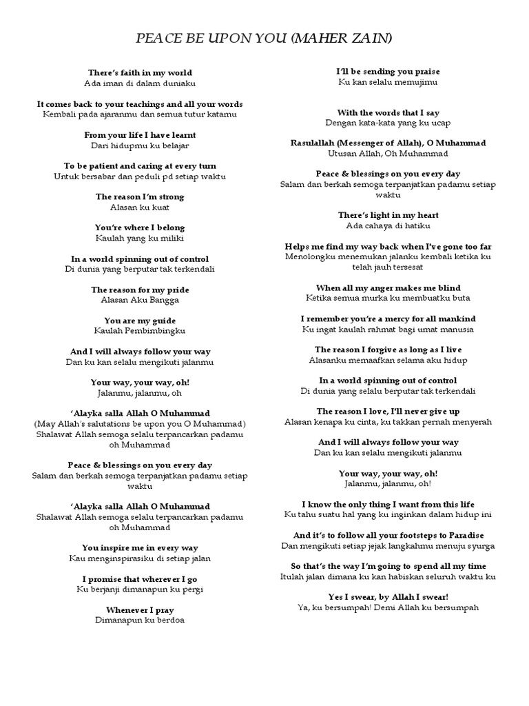 Lirik Dan Terjemah Maher Zain Peace Be Upon You Youtube