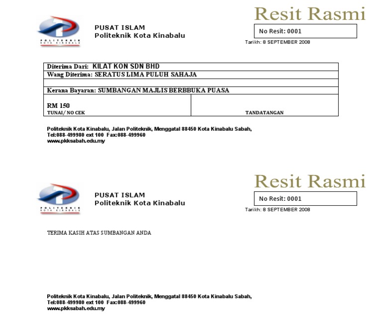 Pusat Islam Politeknik Kota Kinabalu No Resit 0001